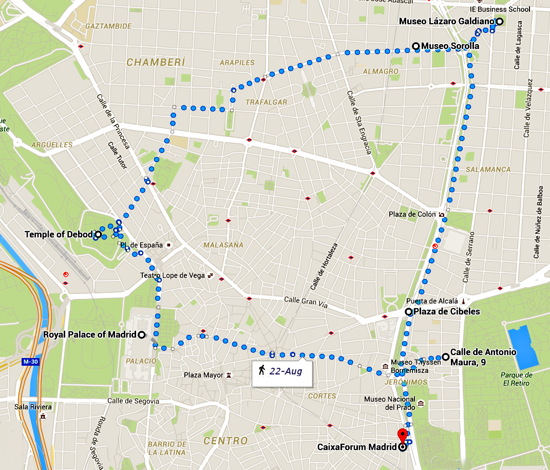 Ponovo smo se provozali gradskim prevozom, stigli do trga Cibeles, a odatle prošetali do galerije Caixa Forum u kojoj su u toku dve veoma zanimljive izložbe. Jedna je posvećena drevnom Egiptu, pod nazivom „Životinje i faraoni – životinjsko carstvo u starom Egiptu”, a druga, još zanimljivija, nazvana „Zlato, mitovi i rituali“ pružila nam je priliku da po prvi put vidimo raznovrsne predmete sa područja današnjeg Perua iz perioda pre evropskog osvajanja. Ovde, nažalost, fotografisanje nije bilo dozvoljeno.